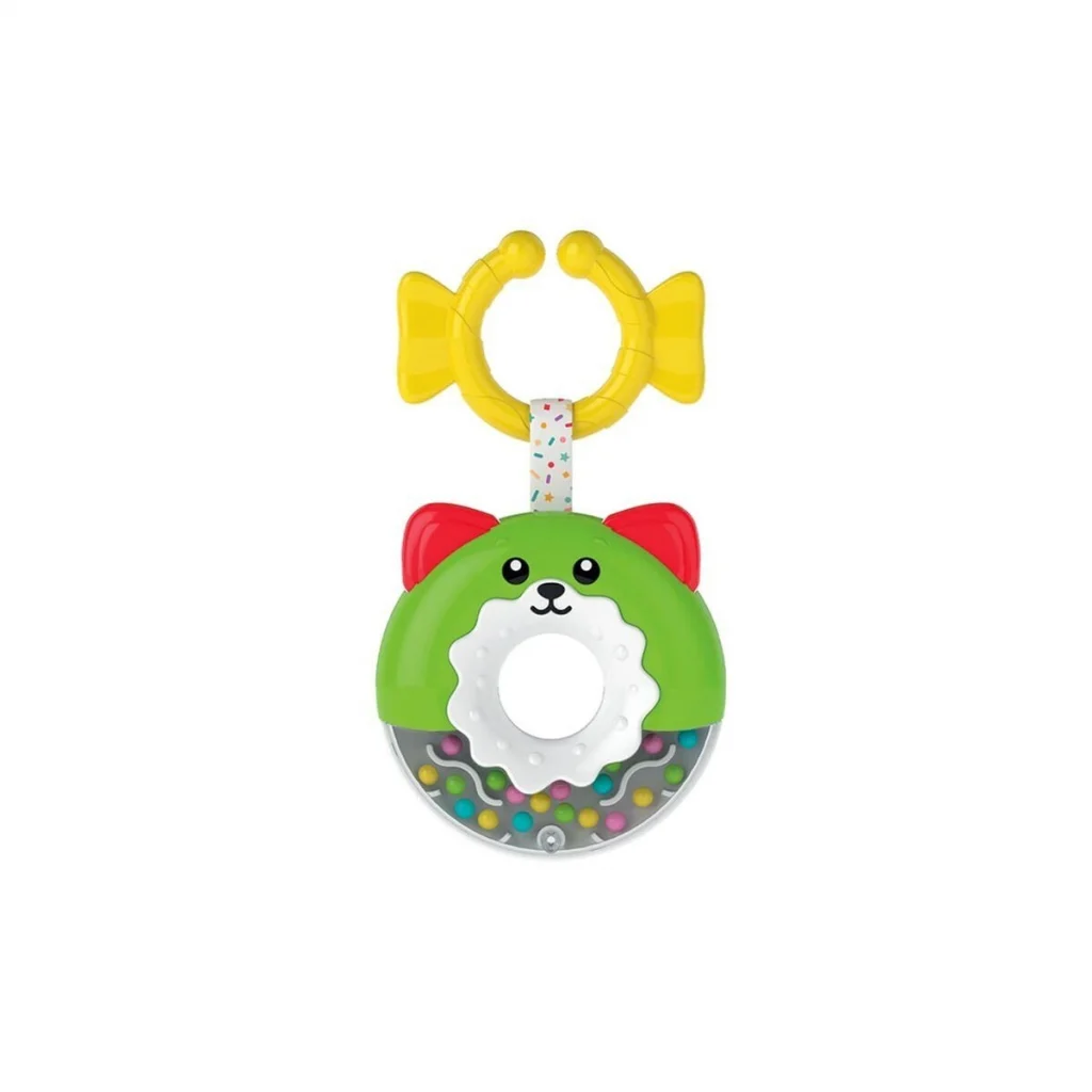 -Çocuğun ısırabileceği dokulara sahip, kaplamalı çörek şeklinde bir çıngırak ve onu karyolaya ya da bebek arabasına asmak için pratik bir halka.