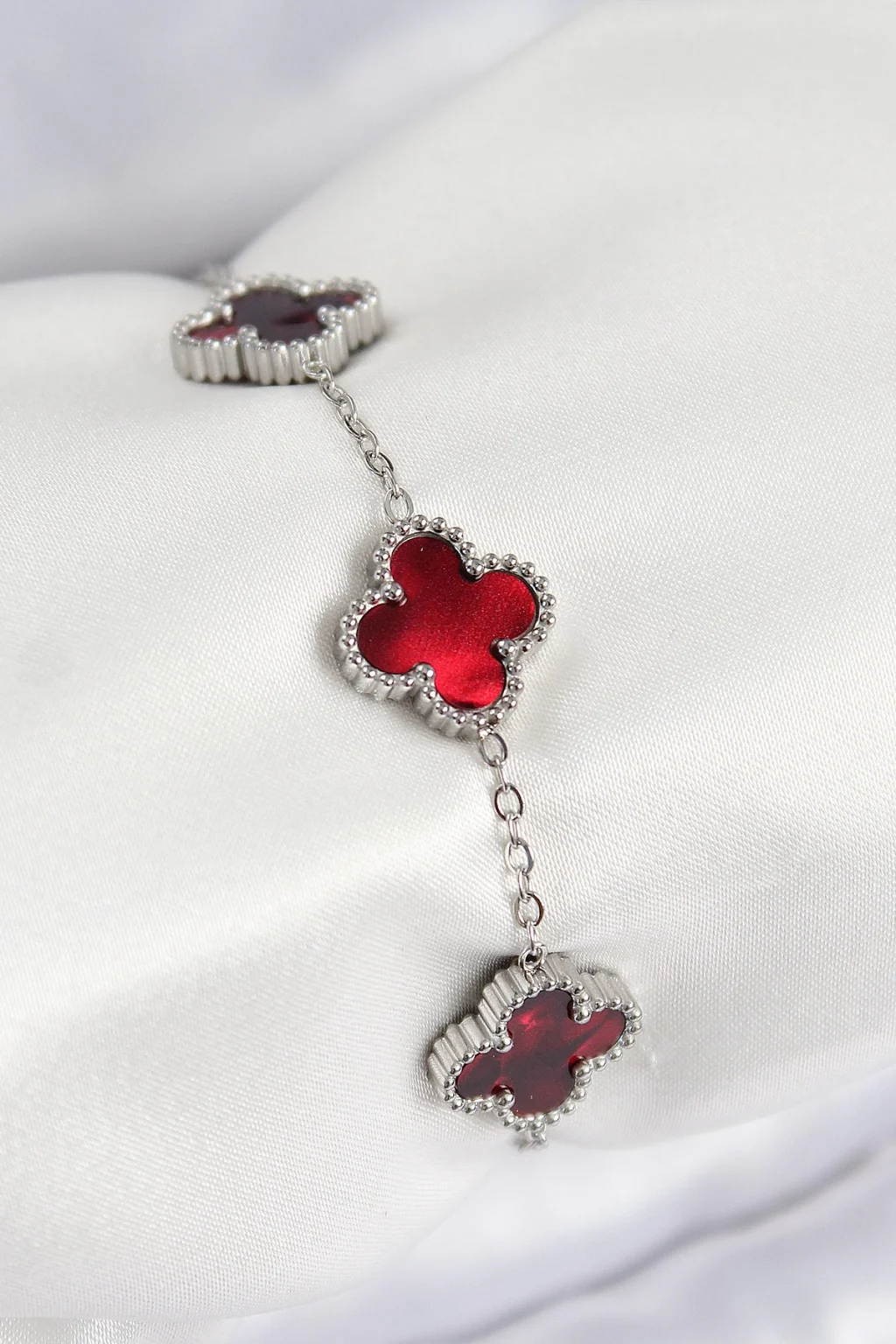 316L Çelik Sedefli Kırmızı Gümüş Renk Yonca Kadın Bileklik