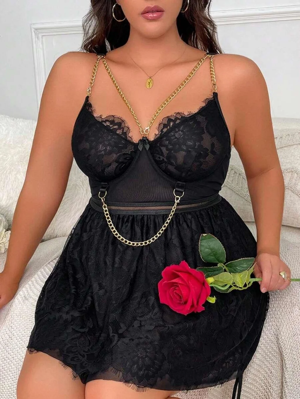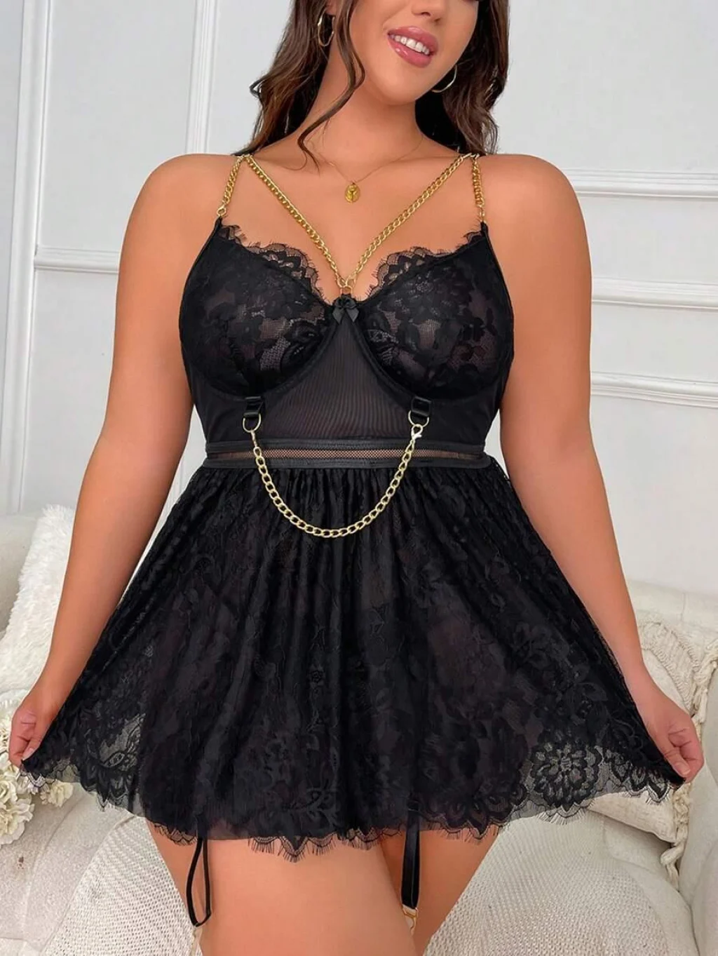 Luz&Pos Aria's Closet Özel Tasarım Büyük Beden Fantezi Zincir Detaylı Dantelli Gecelik