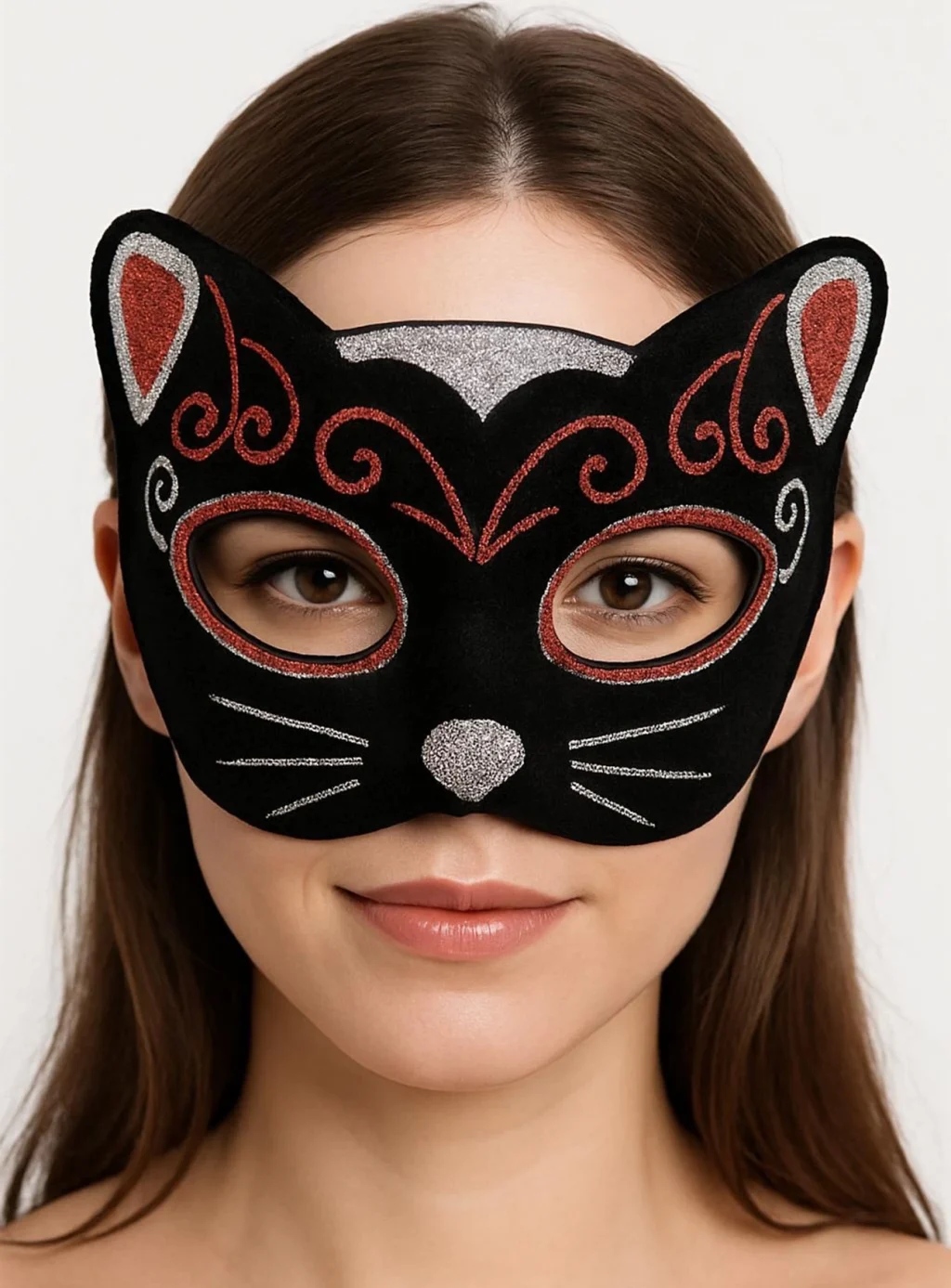 Kadife Dokulu Sim Detaylı Işıltılı Kedi Maskesi Kırmızı Gümüş 20x13 Cm