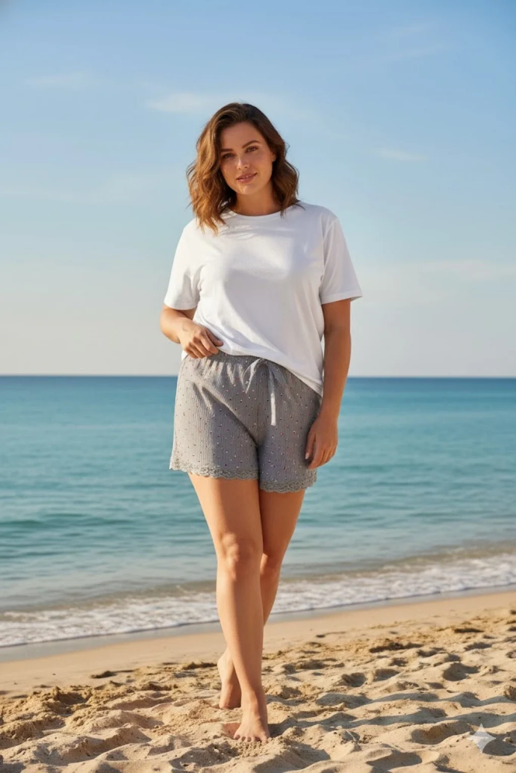 Bambu Fitilli Kadın Ev Şortu Bacak Dantel Detaylı Ev Giyim Gri