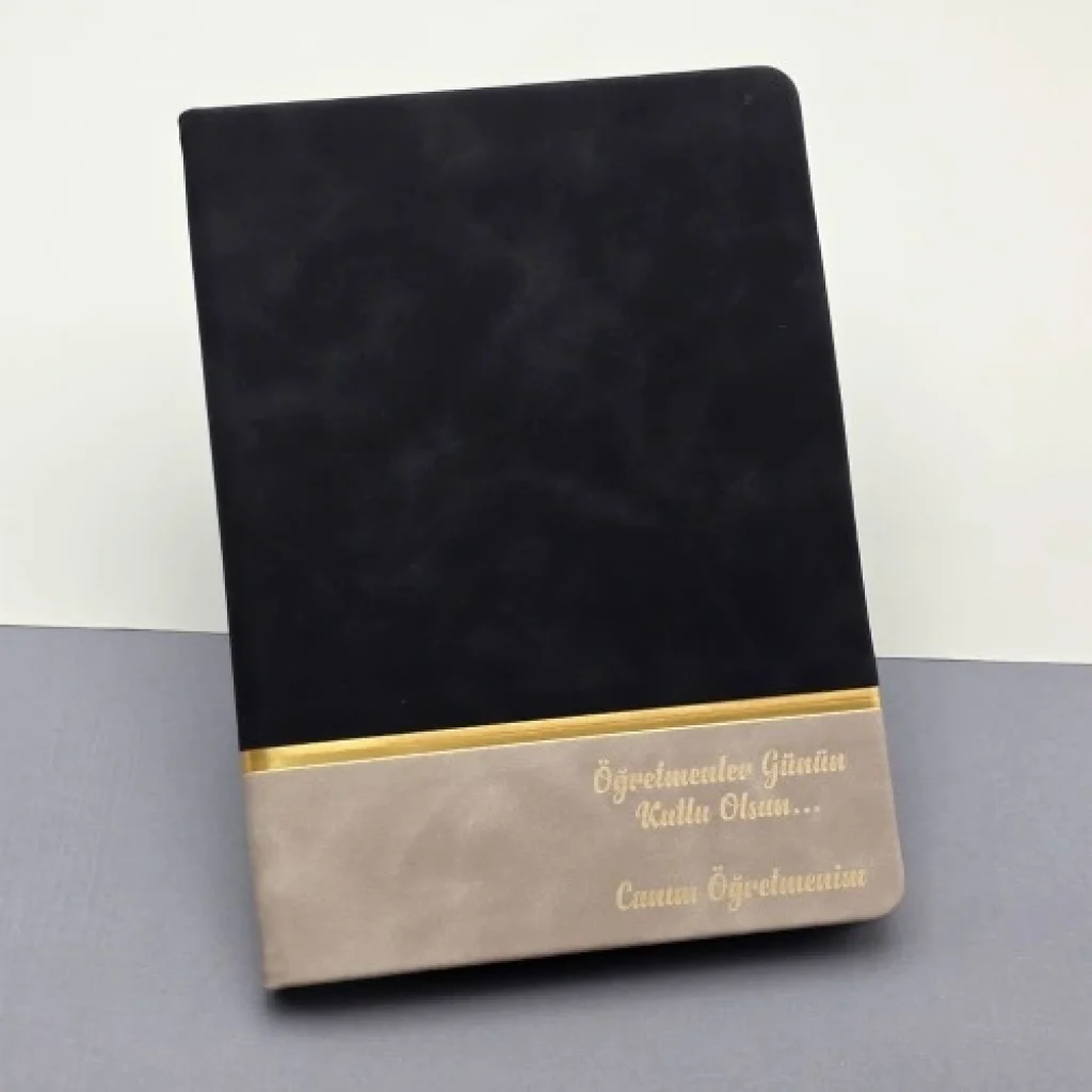 24 Kasım Öğretmenler Günü Hediyesi 24 Kasım Öğretmenler Günü için özel olarak tasarlanan siyah termo deri defter, şık altın yaldız detayları ve üzerindeki “Öğretmenler Günün Kutlu Olsun Canım Öğretmenim” yazısıyla öğretmenlere verilebilecek en anlamlı hediyelerden biridir. Estetik tasarımı, kaliteli malzemesi ve özel lazer baskısı sayesinde hem uzun ömürlü hem de göz alıcı bir hediyelik üründür.Öğretmenler Günü hediyeleri arasında en çok tercih edilen modellerden biri olan bu özel defter, öğretmeninizin masasında kullanabileceği, her baktığında sizi hatırlayacağı zarif bir armağan sunar. 96 yaprak çizgili sayfa yapısı ve iç kısmındaki ayraç ipi ile hem pratik hem de kullanışlıdır.ÖzelliklerKaliteli termo deri malzemeden üretilmiştir.96 yaprak (192 sayfa) çizgili iç sayfa yapısı.Üzerindeki yazı lazer baskıdır; kalıcı ve silinmez.Siyah zemin üzerinde altın yaldız tasarım.Öğretmenler Günü’ne özel tasarım.İç kısmında ayraç ip bulunmaktadır.Şık, modern ve dikkat çekici görünüm.Ürün ölçüsü: 21 cm x 15 cm