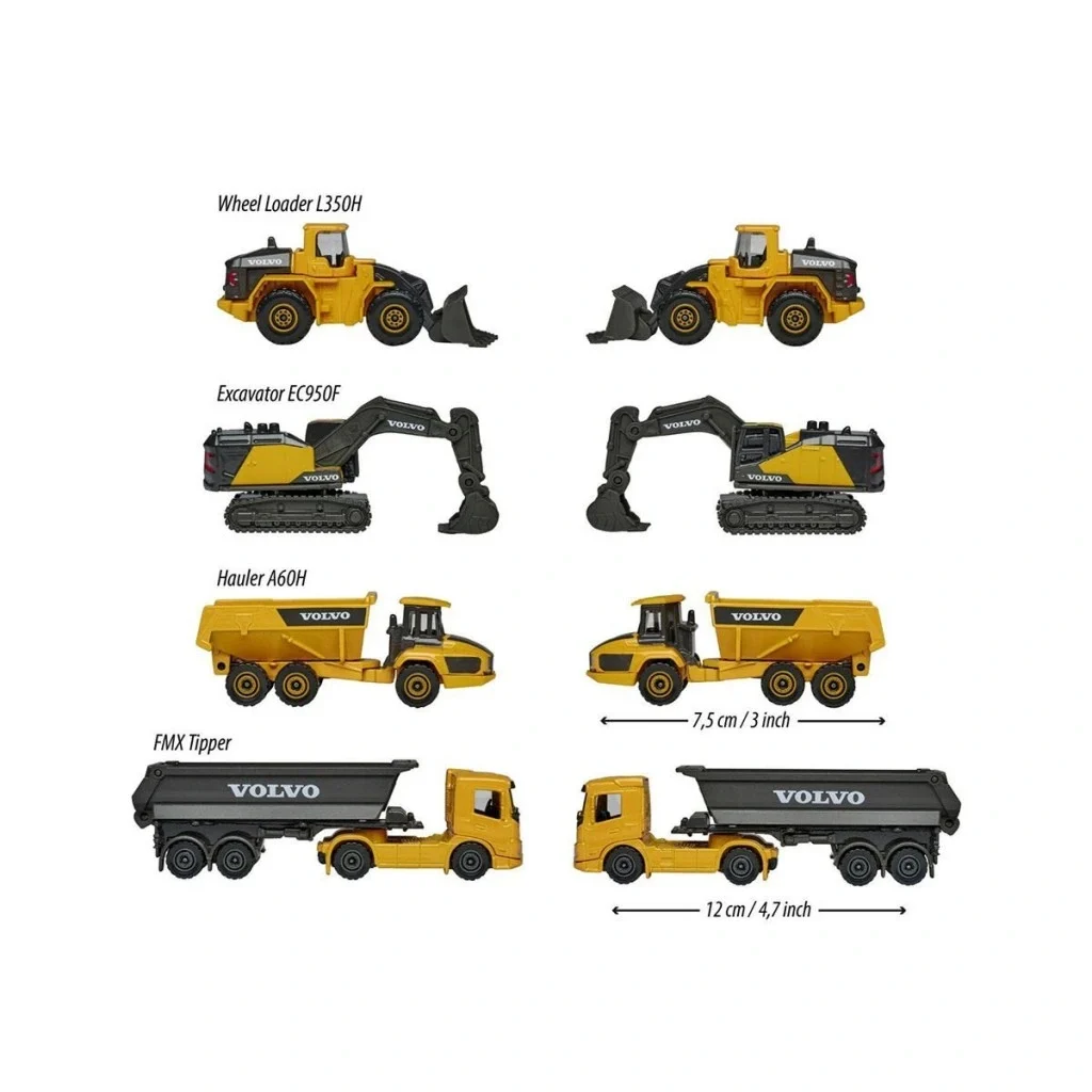 Majorette 4 Volvo inşaat aracından oluşan hediye seti: Ekskavatör, dozer, damperli kamyon, ve tır içermektedir.