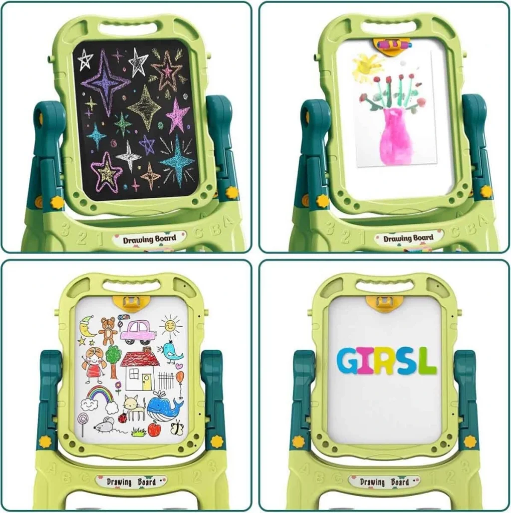 Çift taraflı olması sayesinde bir yüzünde kara tahta gibi tebeşir ile çizim yapabilir, diğer yüzünde renkli kalemler ile