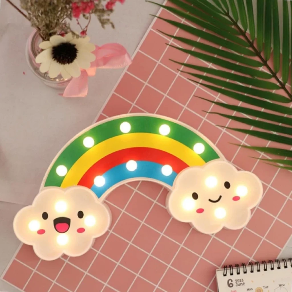 GÜLEN BULUTLU GÖKKUŞAĞI LED GECE LAMBASIÜrün ÖzellikleriGülen Bulutlu Gökkuşağı LED Gece Lambası, çocuk odalarına neşe ve huzur katmak için tasarlanmış dekoratif ve işlevsel bir aydınlatmadır. 30x16 cm boyutundaki bu şirin gece lambası, gökkuşağı formu ve gülen bulut figürleriyle hem sevimli bir aksesuar hem de yumuşak ışığıyla rahatlatıcı bir gece arkadaşıdır.Arkasında bulunan asma yerleri sayesinde dilerseniz duvara monte edebilir, dilerseniz masa üstünde kullanabilirsiniz. Kalem pil ile çalışır ve piller pakete dahil değildir. Gün ışığı rengindeki yumuşak LED ışıkları göz yormaz, loş bir ambiyans oluşturarak çocukların daha huzurlu uyumasına yardımcı olur. Ayrıca enerji tasarruflu yapısıyla uzun süreli kullanım sağlar.Hem çocukların odasında dekoratif bir obje olarak hem de gece lambası ihtiyacını karşılayan bu ürün, şirin tasarımıyla eğlenceli ve güvenli bir ortam oluşturur. Sevdiklerinize hediye edebileceğiniz ideal bir seçenek olarak da öne çıkar.Paket İçeriği1 adet Gülen Bulutlu Gökkuşağı LED Gece Lambası