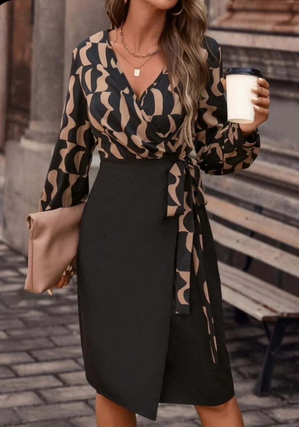 Kadın Uzun Kollu Kruvaze Yaka Dijital Baskılı Fiyonk Detay Atlas Kumaş Elbise