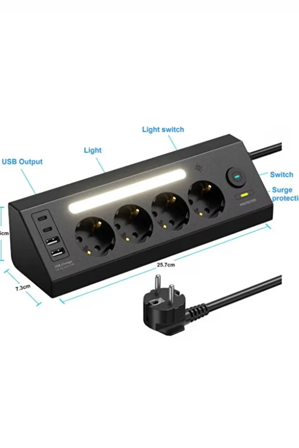 • 4’lü priz çıkışı, 2 USB ve 2 Type-C portunun yanı sıra 2 metre uzunluğundaki esnek ve dayanıklı kablosuyla kullanım kolaylığı sağlar. Uzak mesafedeki prizlere erişim için ideal olan bu grup priz, yüksek gerilim koruması ve gece lambası özelliğiyle çok yönlü kullanım sunar.<br><br>4 Adet AC Priz: Elektronik cihazlarınızı aynı anda çalıştırın.<br>2x USB + 2x Type-C Çıkışı: Akıllı telefon, tablet, kulaklık gibi cihazlar için hızlı şarj imkânı.<br>2 Metre Uzunlukta Güç Kablosu: Uzak priz noktalarına kolay erişi
