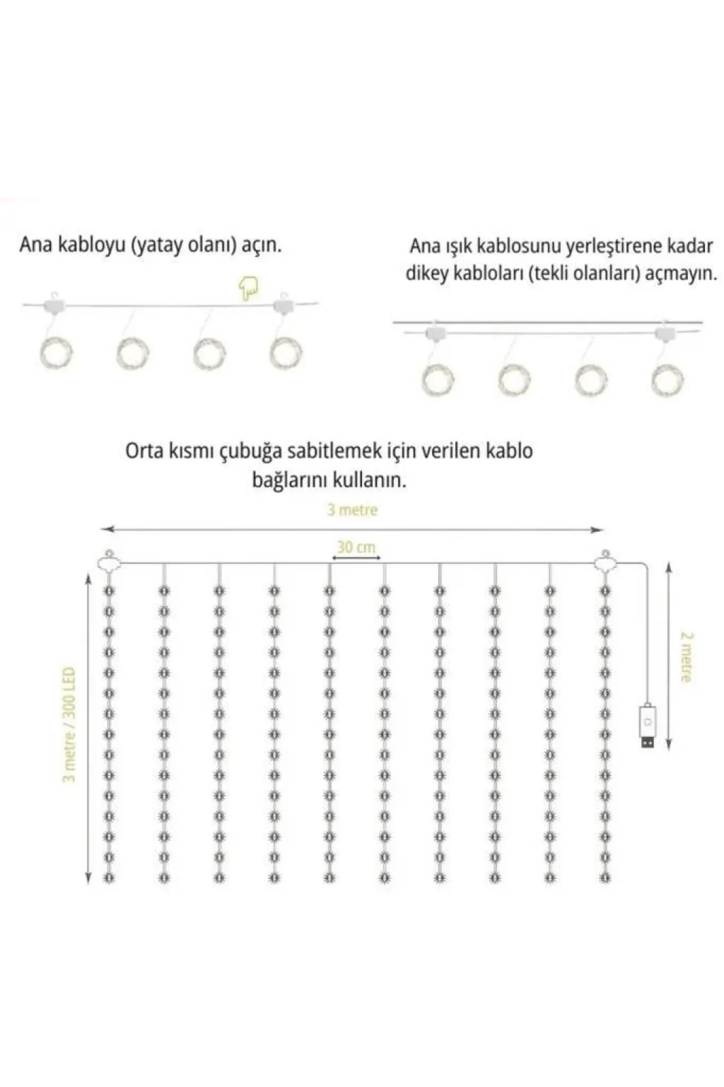 Lw-7 300 Ledli 10 Sarkıt Perde Led Işık, 8 Modlu Uzaktan Kumandalı, 3x3 Metre Peri Telli Led