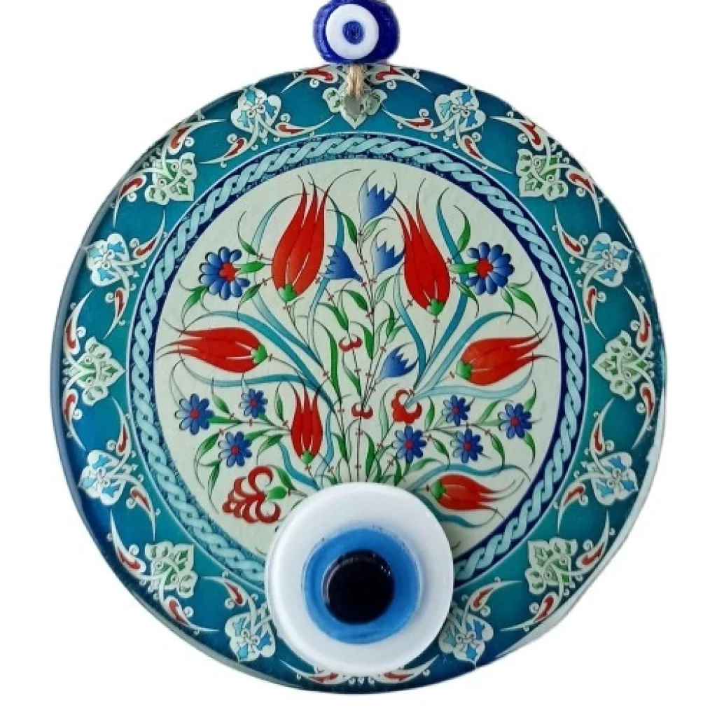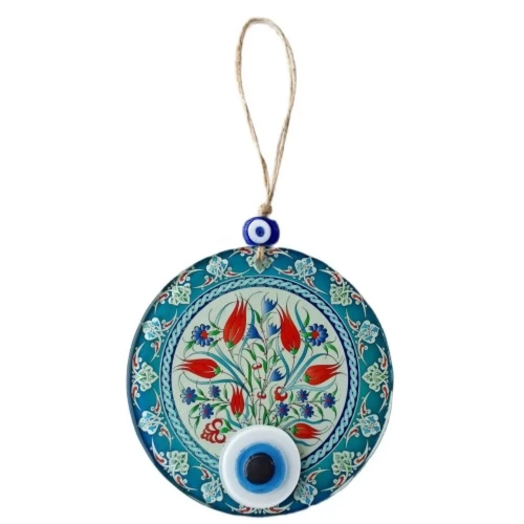 Nazar boncuklu lale desenli duvar süsümüz 15 santimetre çapındadır. Ürünümüz ip dahil yaklaşık 32 santimetre boyundadır. Ürünümüz füzyon cam malzeme kullanılarak üretilmektedir.