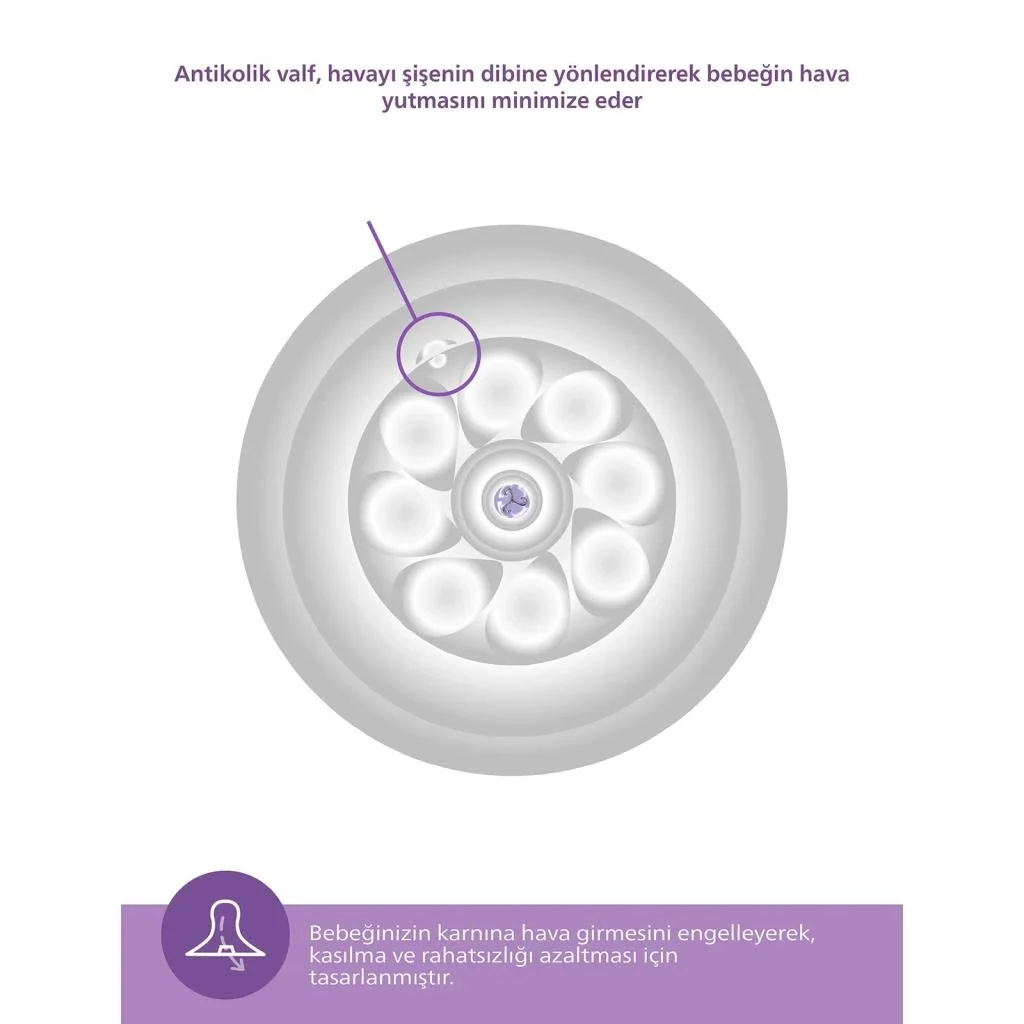Bebeğinizin midesinde hava birikimini en aza indiren ve kolik riskini azaltan anti-kolik teknolojisi, beslenme sırasında bebeğinizin konforunu maksimize eder.