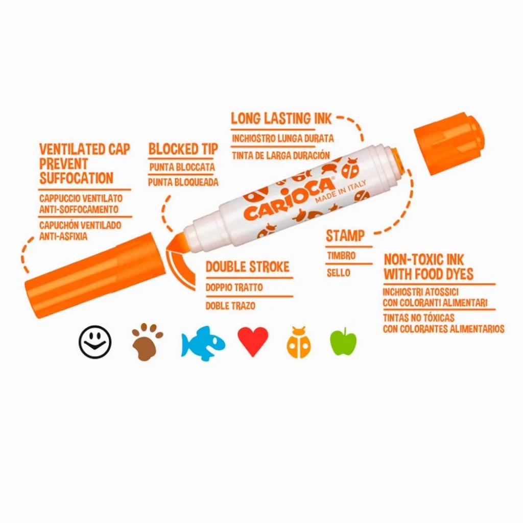Carioca Stamperello Yıkanabilir Keçeli Boya Kalemi 6lı (Bir Ucu Keçeli Kalem Bir Ucu Damga) Özellikleri;
