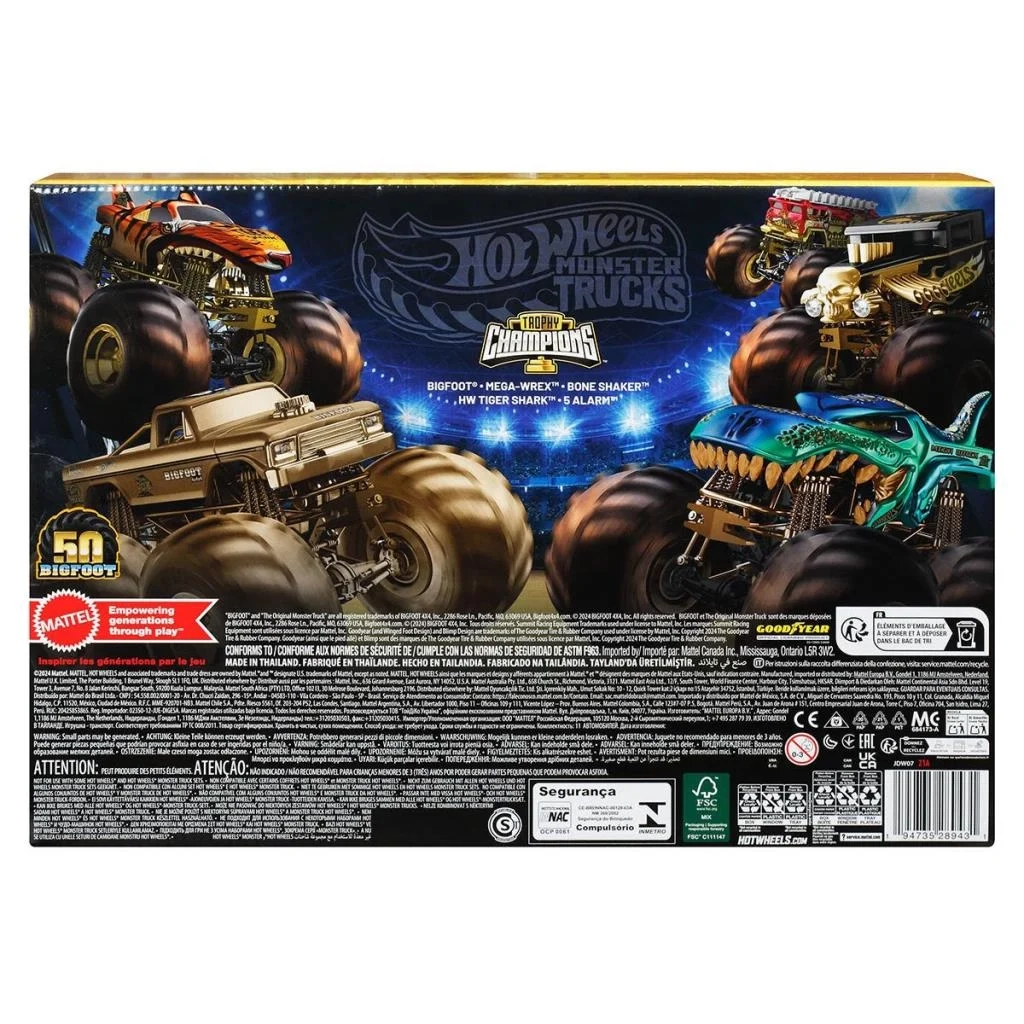 Hot Wheels® Monster Trucks Bigfoot Trophy Şampiyonları Araba ve Kamyon Çoklu Arabalar ile Bigfoot'un 50. yıl dönümünü kutlayın. Bu çoklu pakette, hayranların en sevdiği karakterlerden ilham alan beş oyuncak kamyon ve altı metal araba yer alır.