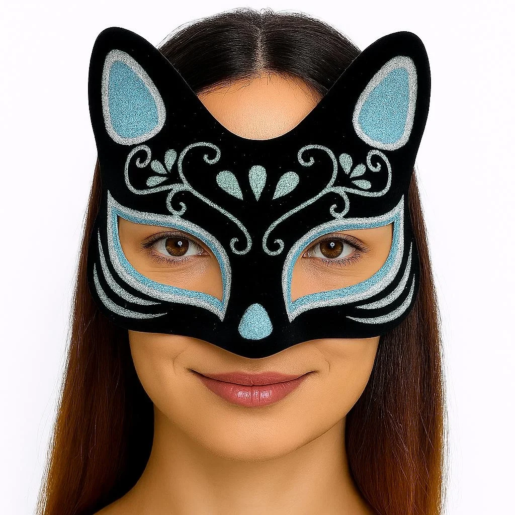 Siyah Renk Üzeri Gümüş Mavi Simli Süet Kaplama Kedi Maskesi ile gizemli ve etkileyici bir görünüm oluşturun ve Kostüm Partisine hazır olun!