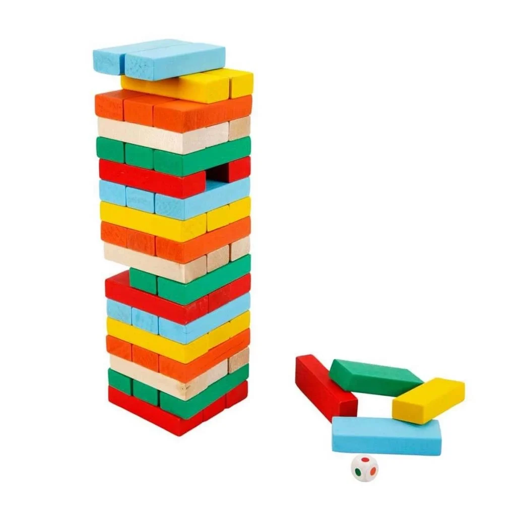 Oyunda amaç tahta blokları çekerek kulenin üstüne koymak, tabii kuleyi devirmeden! Renkli blokları 3’lü sıralar halinde birbirine dik gelecek açılar şeklinde dizin, zarı atın ve oyuna başlayın.