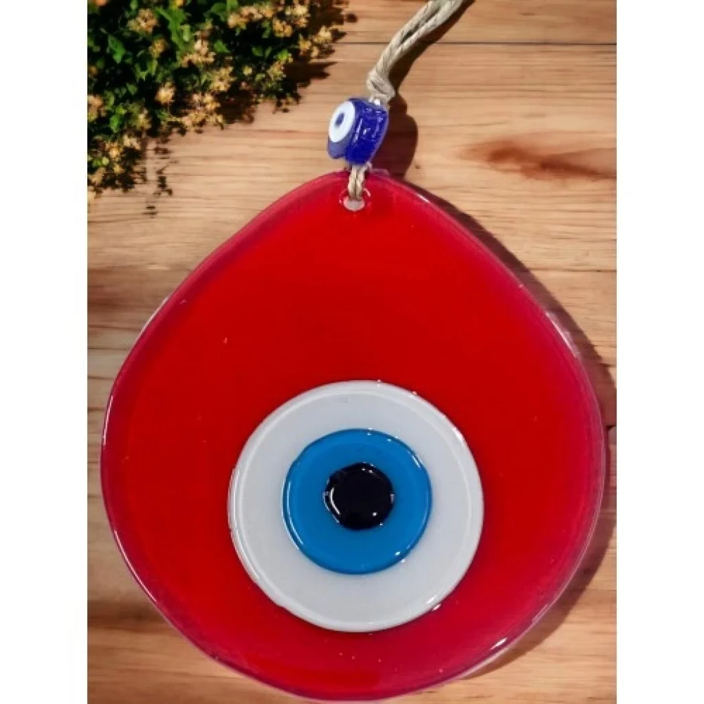 Orta Boy Şeffaf Kırmızı Damla Desen Nazar Boncuklu Duvar Dekoru Cam Duvar süsümüz tamamen el işçiliği ile üretilmiştir. Tasarım harikası el yapımı nazar boncuklu duvar süsümüz 10 x 12 santimetre ölçülerindedir. Ürünümüz ip dahil 21 santimetre boyundadır.