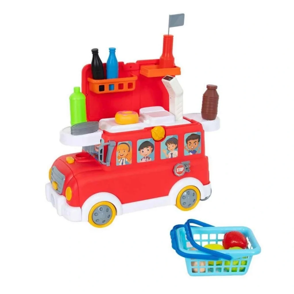 2in1 Sesli ve Işıklı Süpermarket Otobüsü Oyun Seti 28 Parça, oyun saatlerini bambaşka bir boyuta taşıyor. Raflarda içecekler,