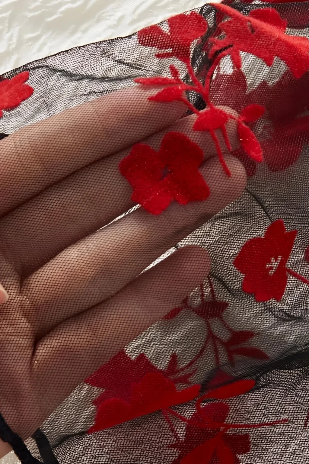 Luz&Pos Arias Closet Transparan Dantel İşlemeli Tül Yırtmaçlı 2'li Kırmızı Gecelik Takımı
