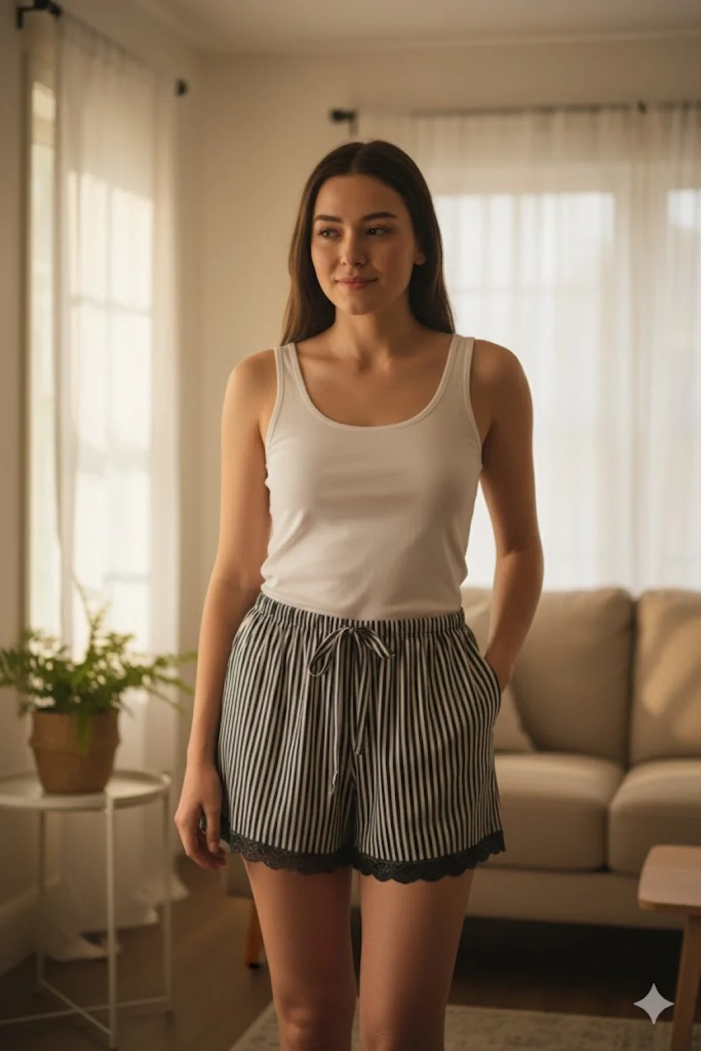 Çizgili Penye Kadın Ev Şortu Bacak Dantel Detaylı Ev Giyim Siyah