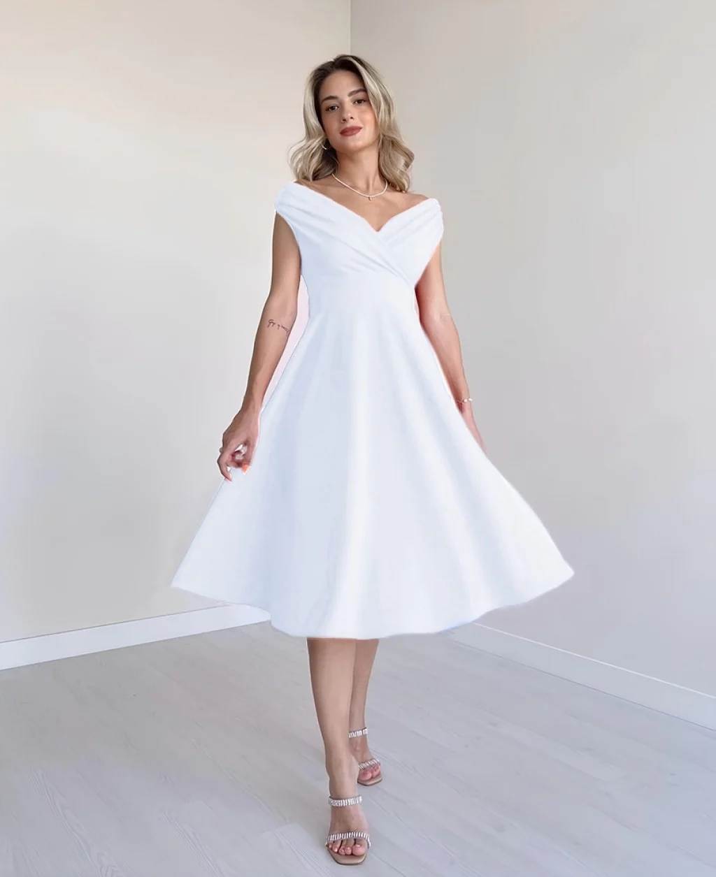 Kadın Kısa Kollu Kruvaze Yaka Eteği Volanlı Krep Elbise
