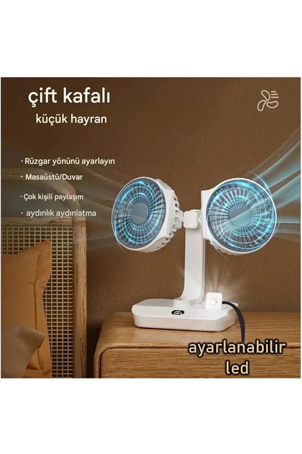 Masaüstü Dijital Ekranlı Çift Fanlı Led Işıklı Soğutucu Fan Ev Ofis Şarjlı Vantilatör