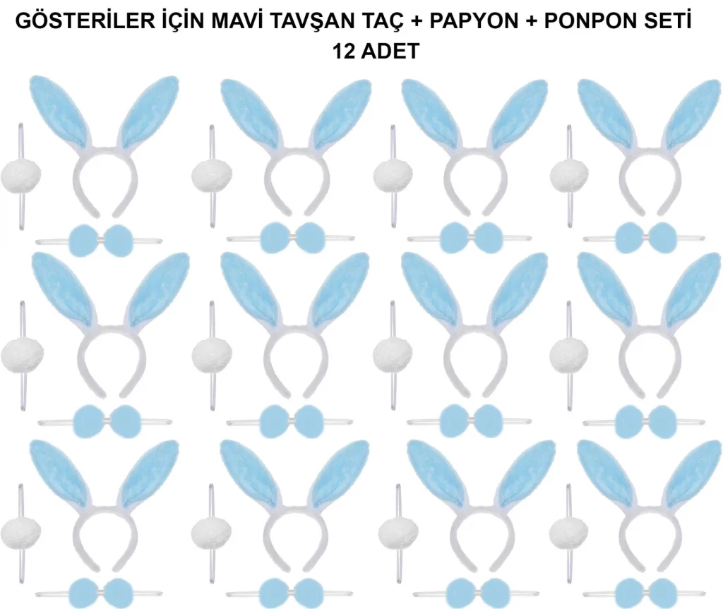 Mavi Tavşan Kostüm Seti – Taç, Papyon, Ponpon (12’li Paket)
