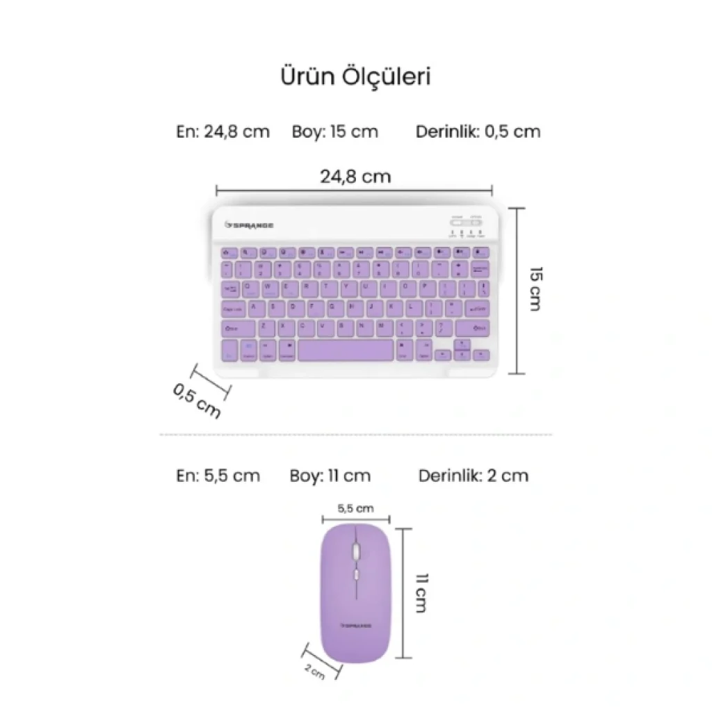 MOR KABLOSUZ KLAVYE VE MOUSE SETİÜrün ÖzellikleriMor Kablosuz Klavye ve Mouse Seti, modern tasarımı ve göz alıcı rengiyle çalışma alanına şık bir görünüm kazandırır. Kablosuz bağlantı teknolojisi sayesinde bilgisayar, telefon ve tablet gibi cihazlarla uyumlu bir kullanım sunar. Türkçe Q düzenindeki multimedya klavyesi yazı yazmayı kolaylaştırırken fonksiyon tuşlarıyla pratik ve hızlı erişim sağlar. Hem klavye hem de mouse üzerinde bulunan Type-C şarj girişleri hızlı ve güvenilir şarj imkânı sunarak uzun süreli kullanımda kesintisiz performans sağlar. Hafif ve kompakt yapısı kolay taşınabilirlik sağlarken ergonomik mouse tasarımı uzun süreli kullanımda bile elinizi yormadan rahat bir tutuş sunar. Estetik tasarımı ve güçlü bağlantı yapısı ile hem günlük kullanım hem de profesyonel çalışma ortamları için ideal bir settir.Paket İçeriği1 Adet Mor Kablosuz Klavye Ve Mouse Seti