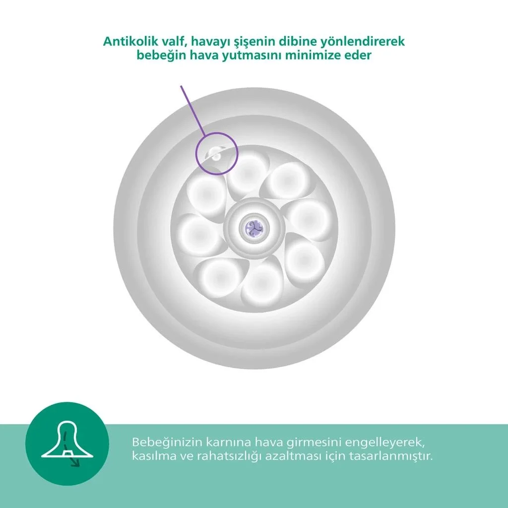 Bebeğinizin midesinde hava birikimini en aza indiren ve kolik riskini azaltan anti-kolik teknolojisi, beslenme sırasında bebeğinizin konforunu maksimize eder.