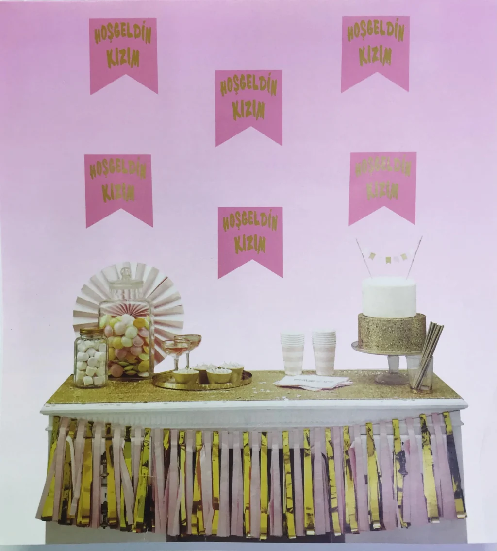 Pembe Üzeri Altın Hoşgeldin Kızım Flama Süs