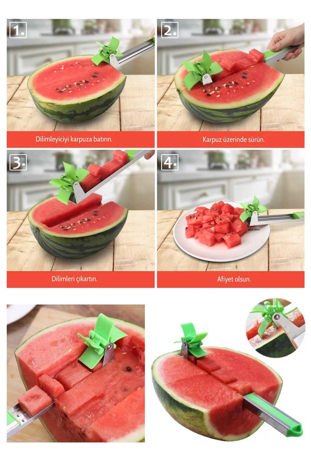 <p>Kullanımı kolay pratik karpuz dilimleyici .</p><p> Karpuzun yüzeyinde ileriye yada geriye sürerek saniyeler içinde nizami dilimler halinde karpuzu dilimleyebilirsiniz.</p><p>Kulanımı kolay ergonomik ve hafif tir. Gövdesi paslanmaz çeliktir , kesici köşeleri olmadığı için çocuklarda kullanabilir.</p><p><b><u>Kullanımı</u></b></p><ul><li>Kesici kısımdan dilediğiniz büyüklüğü ayarlayın.</li><li>dilimleyiciyi karpuzun üzerinde ileriye sürün.</li><li>karpuzun kabuğuna ulaşınca yukarı kaldırıp dilimleri alın.<
