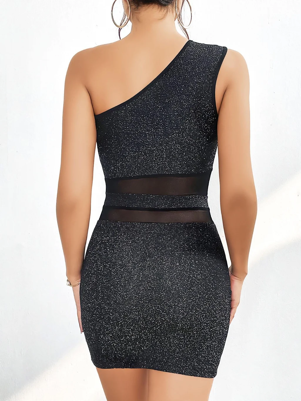 Luz&Pos Arias Closet Özel Tasarım Siyah Tek Omuz Dekolteli Işıltılı Fantezi Mini Club Elbisesi