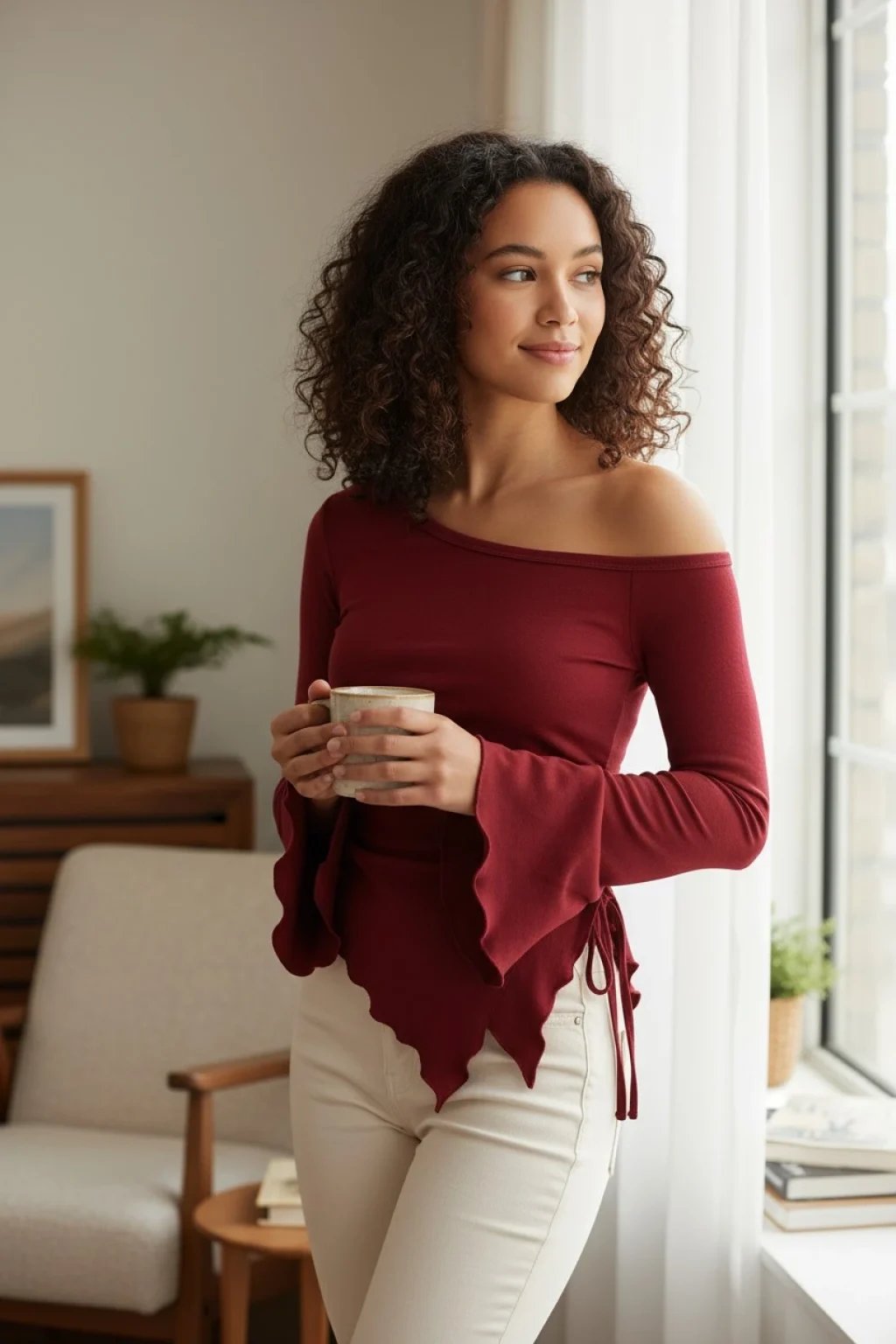 • İster klasik ister modern bir tarzınız olsun, Kadın Bordo Asimetrik Yaka Drapeli Yan Bağlamalı Bluz, gardırobunuzun en özel parçalarından biri olmaya aday.