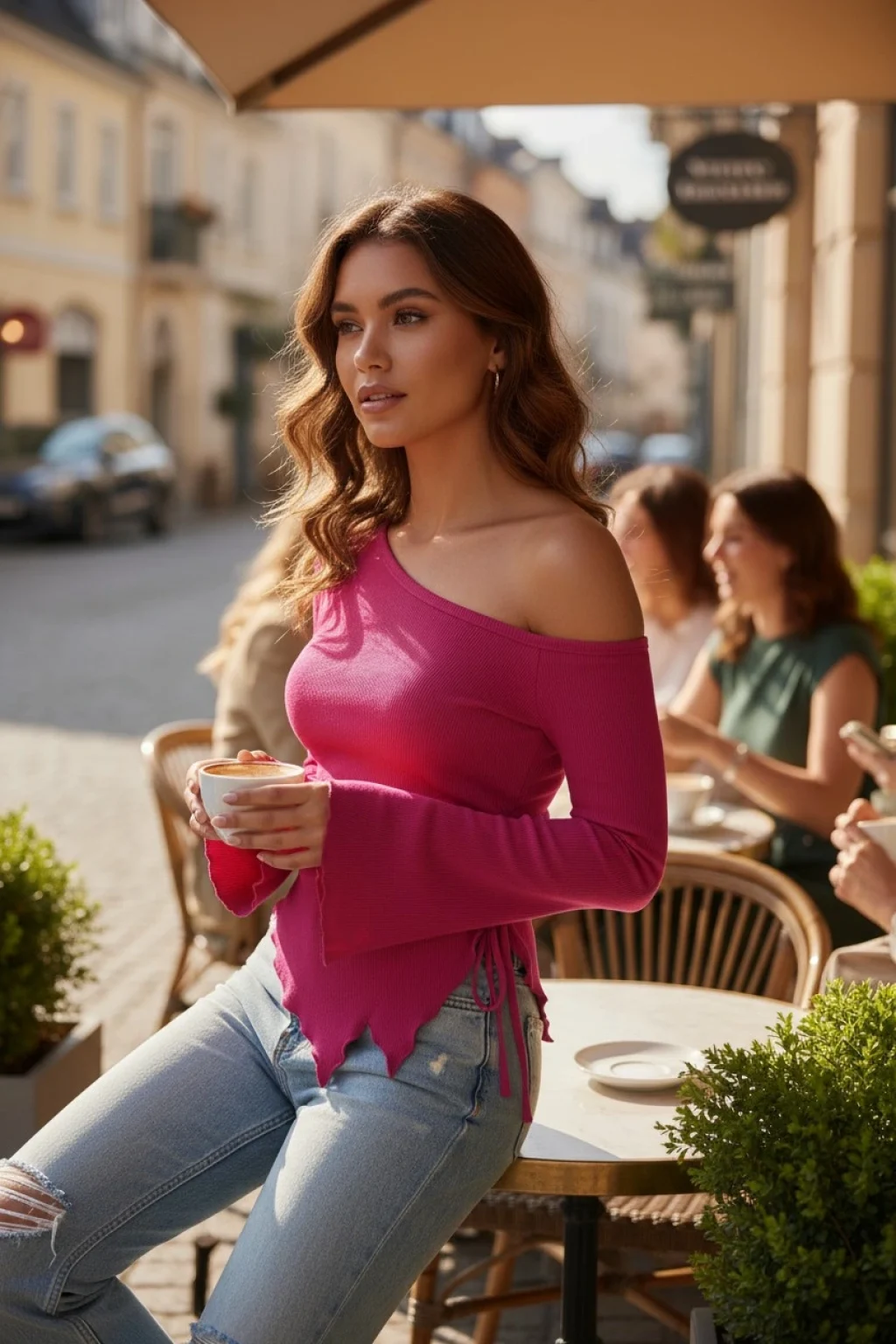 Asimetrik yaka ve yan bağlama detayı feminen bir duruş kazandırır.
