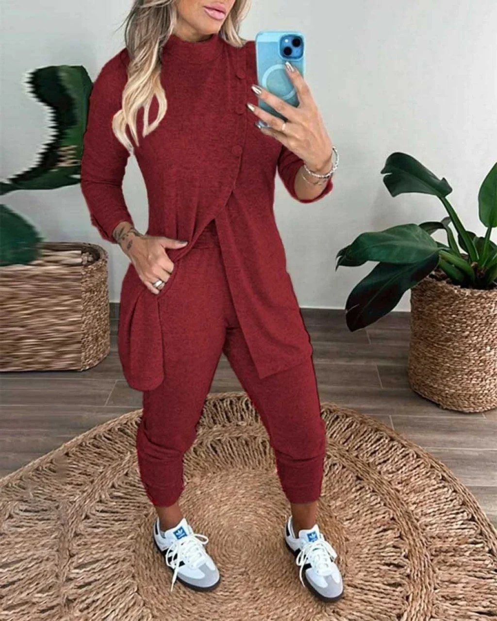 Kadın Uzun Kollu Balıkçı Yaka önden Düğmeli Bluz Ve Pantolon Yumoş Ikili Takım