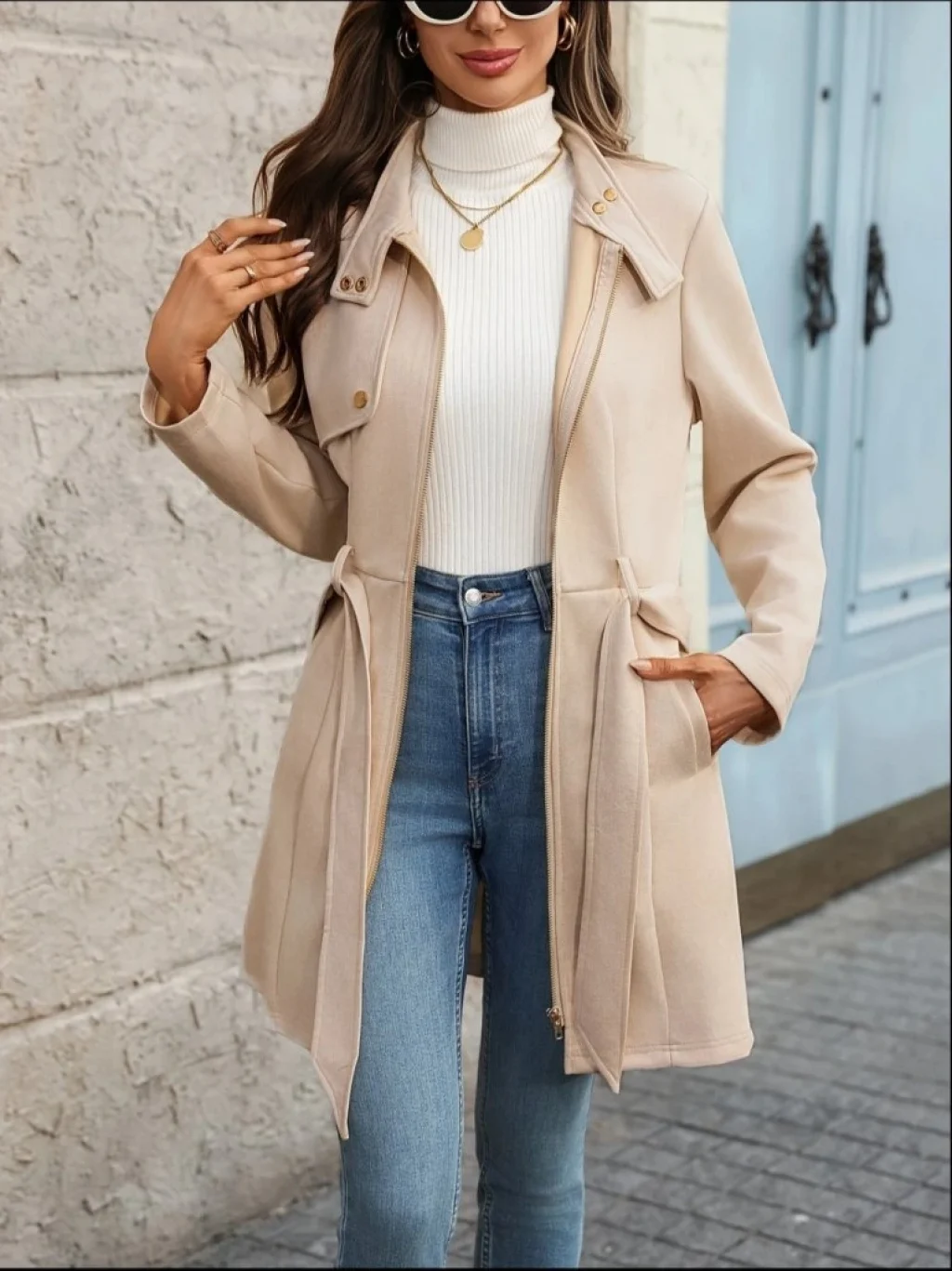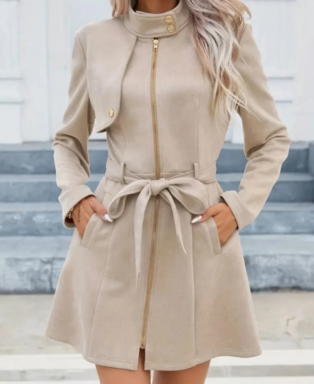 Kadın Uzun Kollu Boyundan Düğmeli Fermuarlı Beli Kuşaklı Süet Ceket
