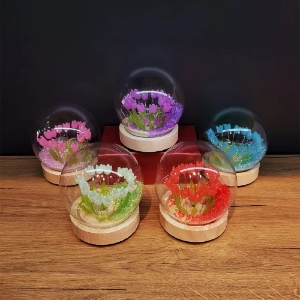 Led Işıklı Lale Cam FanusLed ışıklı lale cam fanus, şık cam fanus içerisinde yer alan rengarenk laleler ile sevdiklerinize özel ve anlamlı bir hediye seçeneği sunar. LED ışığı sayesinde karanlıkta yakıldığında ortamda hoş ve romantik bir ışık yayar. Masanızda veya başucunuzda masa lambası olarak da kullanılabilecek bu fanus, dekoratif süsleri ve zarif tasarımı ile dikkat çeker.Toptan alımlar için ideal olan bu ürün, ev dekorunda trend bir dokunuş sağlar ve hediye amaçlı sunumlar için mükemmeldir. Son zamanların en popüler ışıklı dekoratif ürünlerinden biridir.Ürün Özellikleri:Kaliteli cam malzemeden üretilmiştir.Alt kısmı ahşap malzemedir.Fanus içinde 16 adet rengarenk lale bulunmaktadır.LED ışıklıdır ve 3 adet mini saat pili ile çalışmaktadır.On/Off düğmesi mevcuttur.Karışık renklerde gönderilmektedir.Karanlıkta hoş bir görüntü sağlar.Ürün Ölçüsü: 10 cm