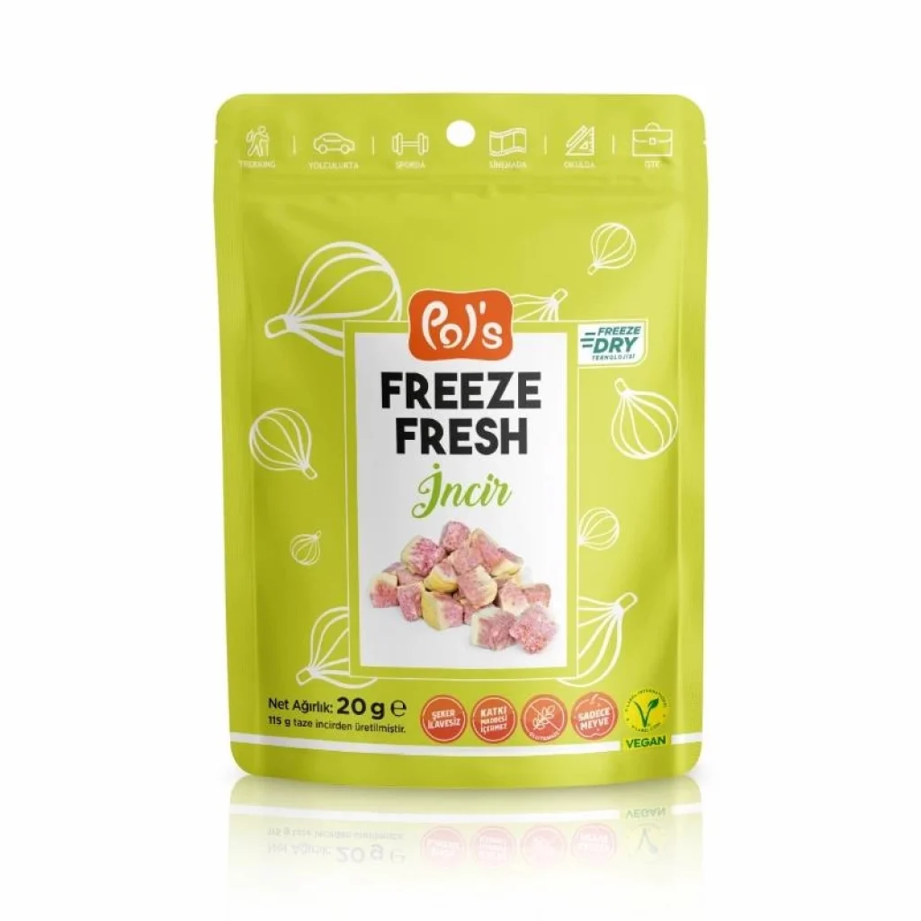 Pol’s Freeze Fresh dondurularak kurutulmuş incir, %100 incir meyvesinin önce dondurulması sonra freeze dry teknolojisi ile kurutulmasıyla elde edilen katkısız, doğal meyve atıştırmalığıdır.