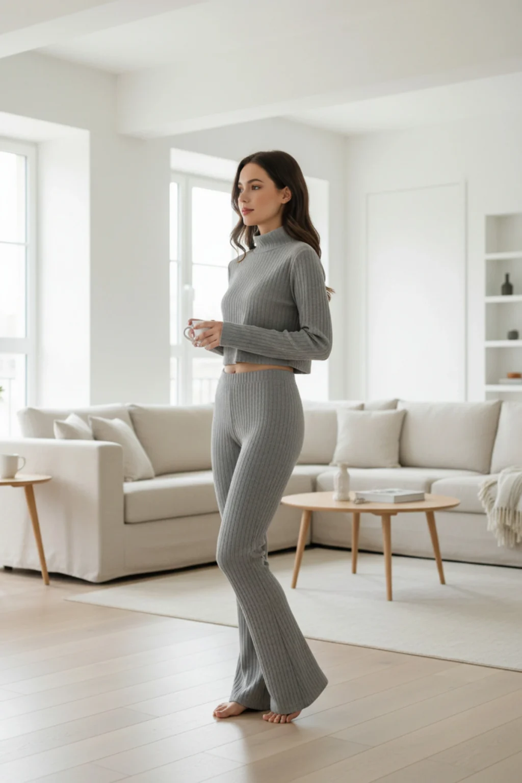 • Boğazlı crop üst tasarımı, sade ama güçlü bir duruş sağlarken; ispanyol paça pantolon kesimi vücut formunu dengeli şekilde ortaya çıkarır.