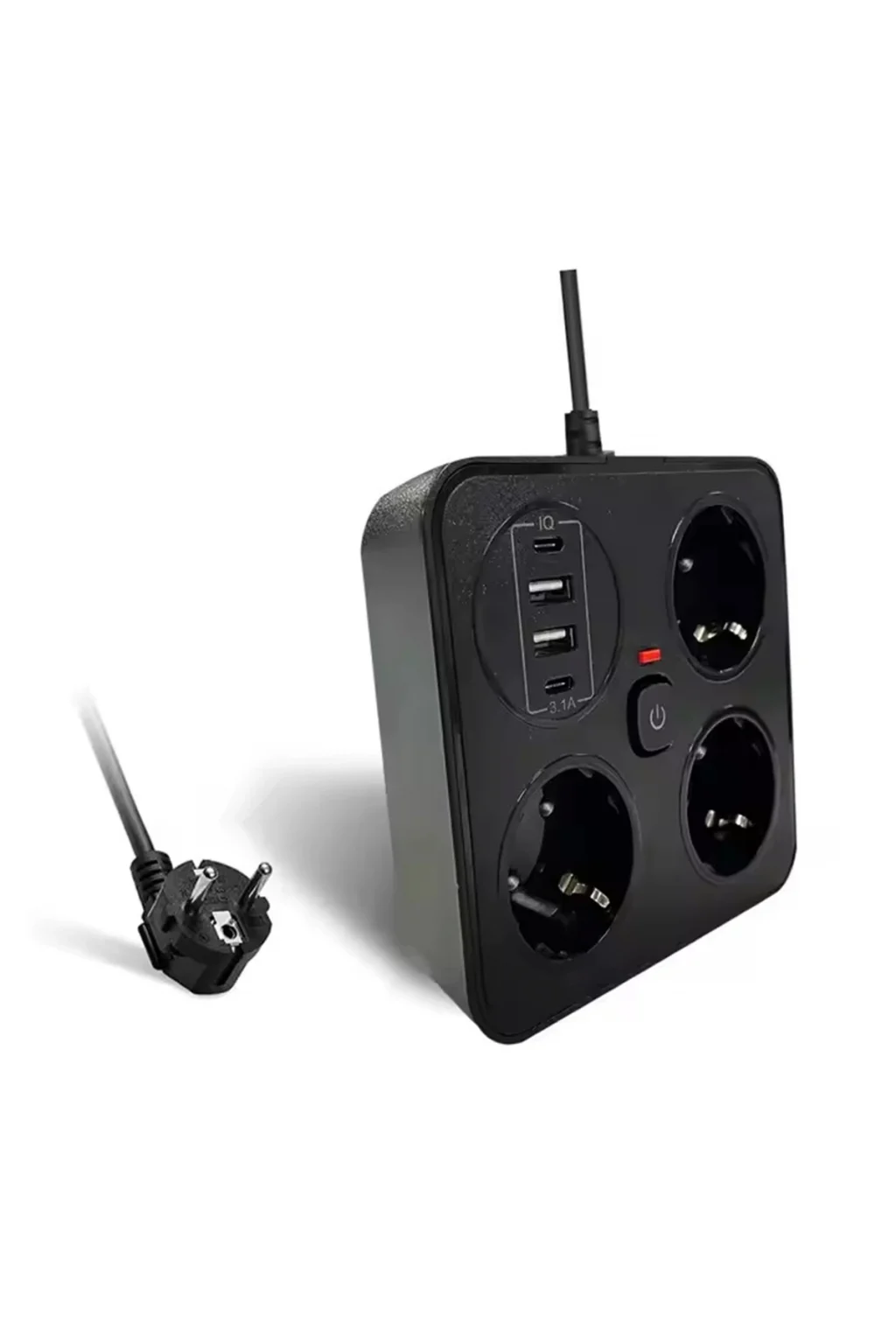 Akım Korumalı Anahtarlı Priz - 3x Priz - 2x Usb - 2x Type-c - 2 Mt Kablo Hızlı Şarj Özellikli Siyah