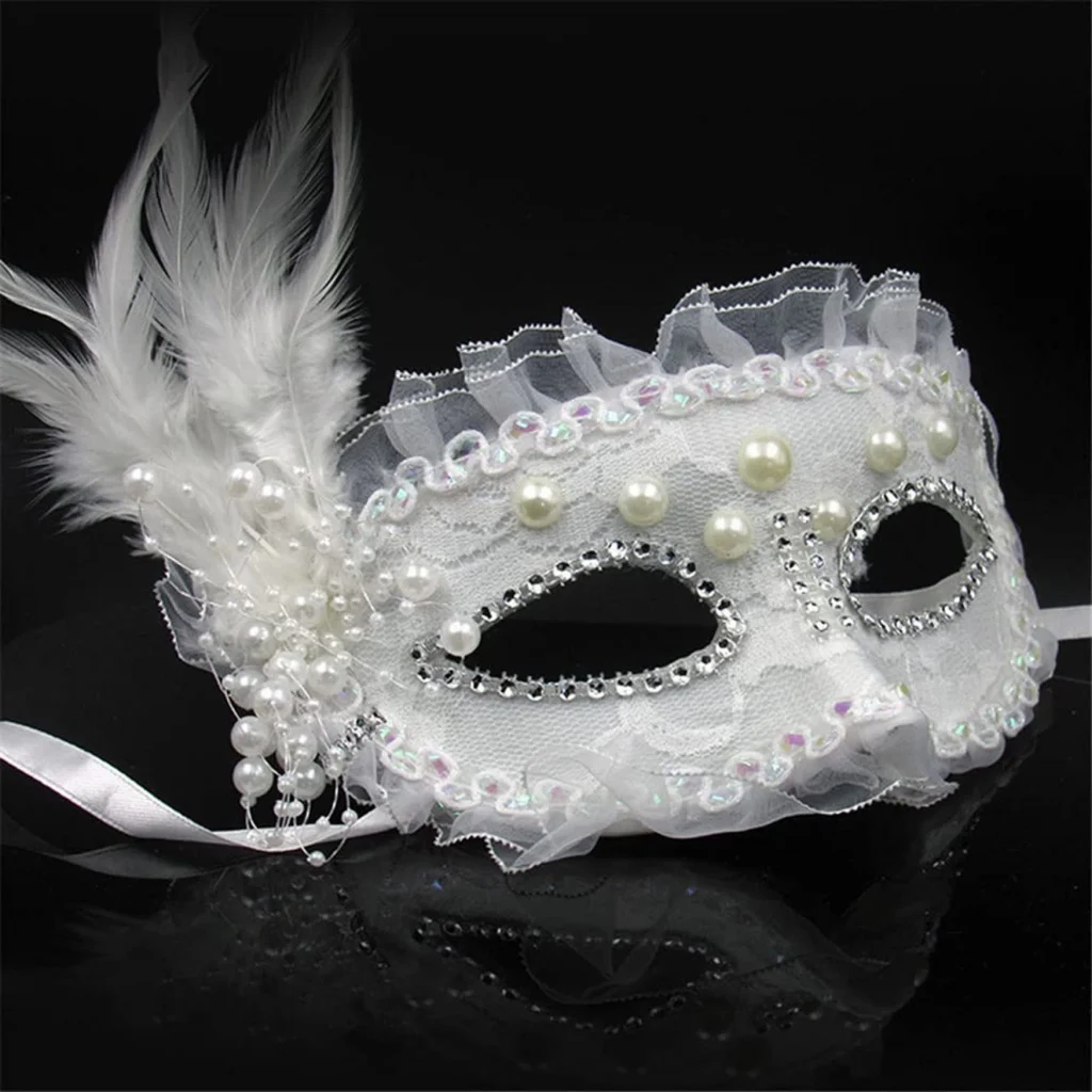 Beyaz Renk Yandan Tüylü İnci İşlemeli Taşlı Dantelli Parti Maskesi 17x12 Cm