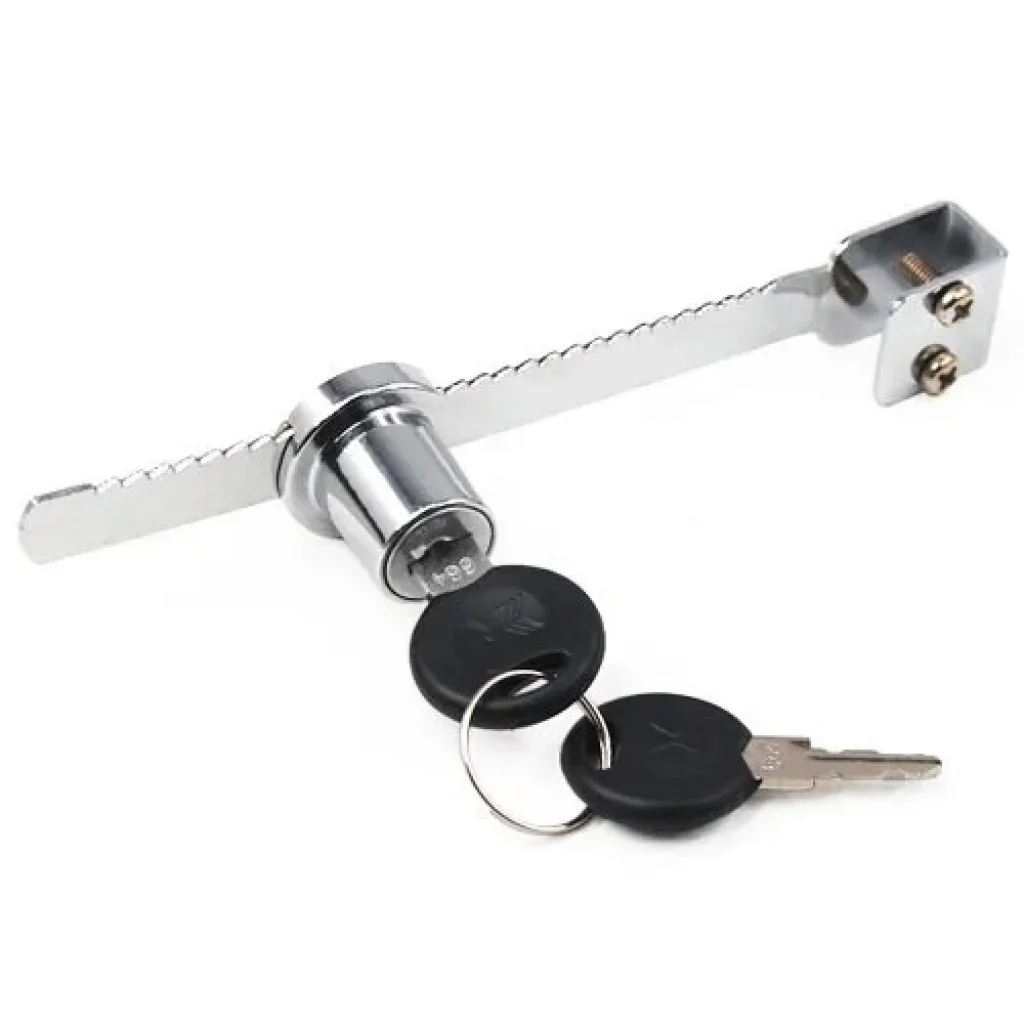 <h3>Ürün Tanımı</h3><p>Bu ürün, özellikle ecza dolapları ve ilan panolarında kullanılan kayar cam kilididir. Cam kapakların güvenli bir şekilde kilitlenmesi ve açılmasını sağlamak için tasarlanmış olan bu kilit, hem güvenlik hem de işlevsellik sunar.</p><h3>Özellikler</h3><ul> <li><strong>Malzeme:</strong> Genellikle metal veya yüksek kaliteli plastik malzemeden üretilir. Metal kilitler genellikle daha dayanıklı ve uzun ömürlüdür, plastik kilitler ise hafif ve ekonomik olabilir.</li> <li><strong>Tasarım:</s