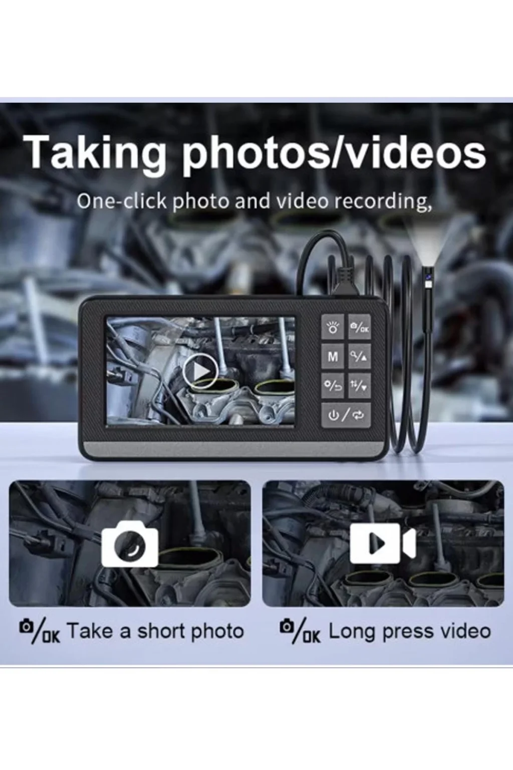 • <br>Özellik:<br>Yarı sert kablo yeterince uzun ve tutması kolay, ulaşılması zor alana girin. IP67 su geçirmez kamera, endoskop nemli ortamda çalışabilir, hatta su altına daldırabilirsiniz.<br>Yüksek çözünürlüklü lens ve 8 ayarlanabilir LED ışık ile 4.3 inç LCD ekranı benimser, net görüntüler yakalayabilir ve video kaydedebilir. Telefona veya uygulamaya gerek yok.<br>Gelişmiş sensör, net görüntüler, yüksek kontrast ve yüksek hassasiyetli ayrıntılar sağlar. Yüksek çözünürlüklü 1920x1080 piksel görüntü ile, in