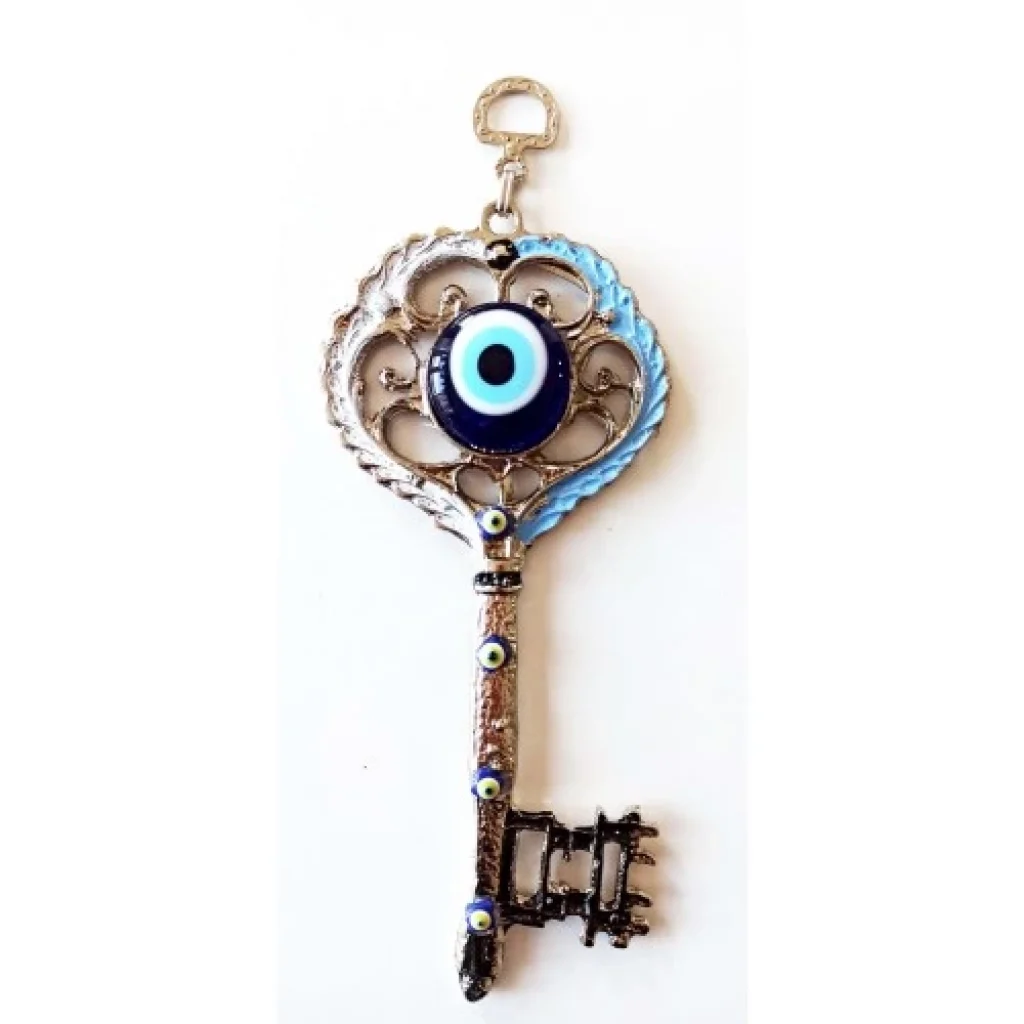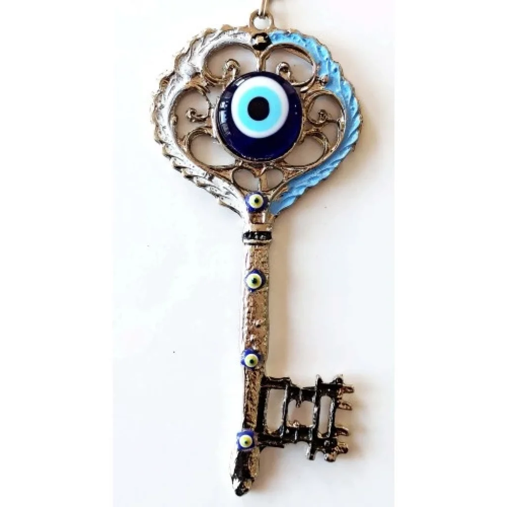 Gümüş Kaplama Nazar Boncuklu Beyaz Ve Mavi Nostaljik Anahtar Şekilli Duvar Süsü