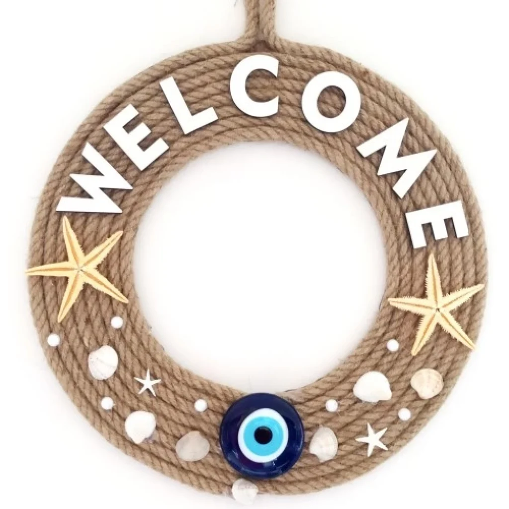 Jüt ipten welcome yazılı kapı süsümüz deniz yıldızı, inci ve deniz kabuklarıyla süslenmiştir. Nazar boncuklu welcome kapı süsümüz 30 x 30 santimetre ölçülerindedir.