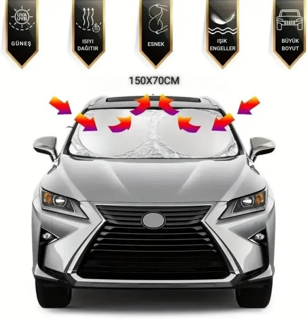 ☀️ Çift katmanlı milfon yapısı sayesinde güneş ışınlarını etkili şekilde yansıtarak aracınızın içini serin tutar ? Geniş 150x70 cm ölçüsü ile çoğu otomobilin ön camına tam uyum sağlar ? Katlanabilir ve kompakt tasarımı ile kullanım sonrası katlanıp kılıfına yerleştirilerek çantada veya araç içinde kolaylıkla taşınabilir ?️ Dayanıklı ve kaliteli malzemeden üretilmiştir, uzun ömürlü kullanım sunar ? Hem binek araçlarda hem de SUV gibi daha geniş araç modellerinde rahatlıkla kullanılabilir ?️ Özellikle yaz aylarında güneşin zararlı UV ışınlarına karşı koruma sağlar, torpido ve direksiyonun ısınmasını önler ? İşe giderken, uzun seyahatlerde, tatil veya park halinde araç kullanımında etkili çözüm sunar ? Estetik tasarımı ile aracınızın iç görünümünü bozmadan şık bir çözüm sunar ? Ürünü katladığınızda çok az yer kaplar, torpido gözüne, koltuk altına veya bagajınıza kolayca sığar ?‍?‍?‍? Çocuklu aileler için özellikle idealdir, çocuk koltuğunun bulunduğu bölgenin aşırı ısınmasını önler ?️ Araç park halindeyken güneş ışınlarının zararlı etkilerine karşı ekstra koruma sunar ? Kaliteli, ısıya ve deformasyona dayanıklı madde ile sizi uzun süre yarı yolda bırakmayan sade ve kullanışlı bir üründür ? Üniversal tasarımı sayesinde farklı marka ve araç modellerine yüksek uyum gösterir ✨ Aracınızın iç estetiğine zarar vermez, modern ve dikkat çekmeyen görünümü ile işlevini sessizce yerine getirir ?️ Araç içinde klima etkisini güçlendirirken, güneşli günlerde yakıt tasarrufuna olumlu katkı sunar
