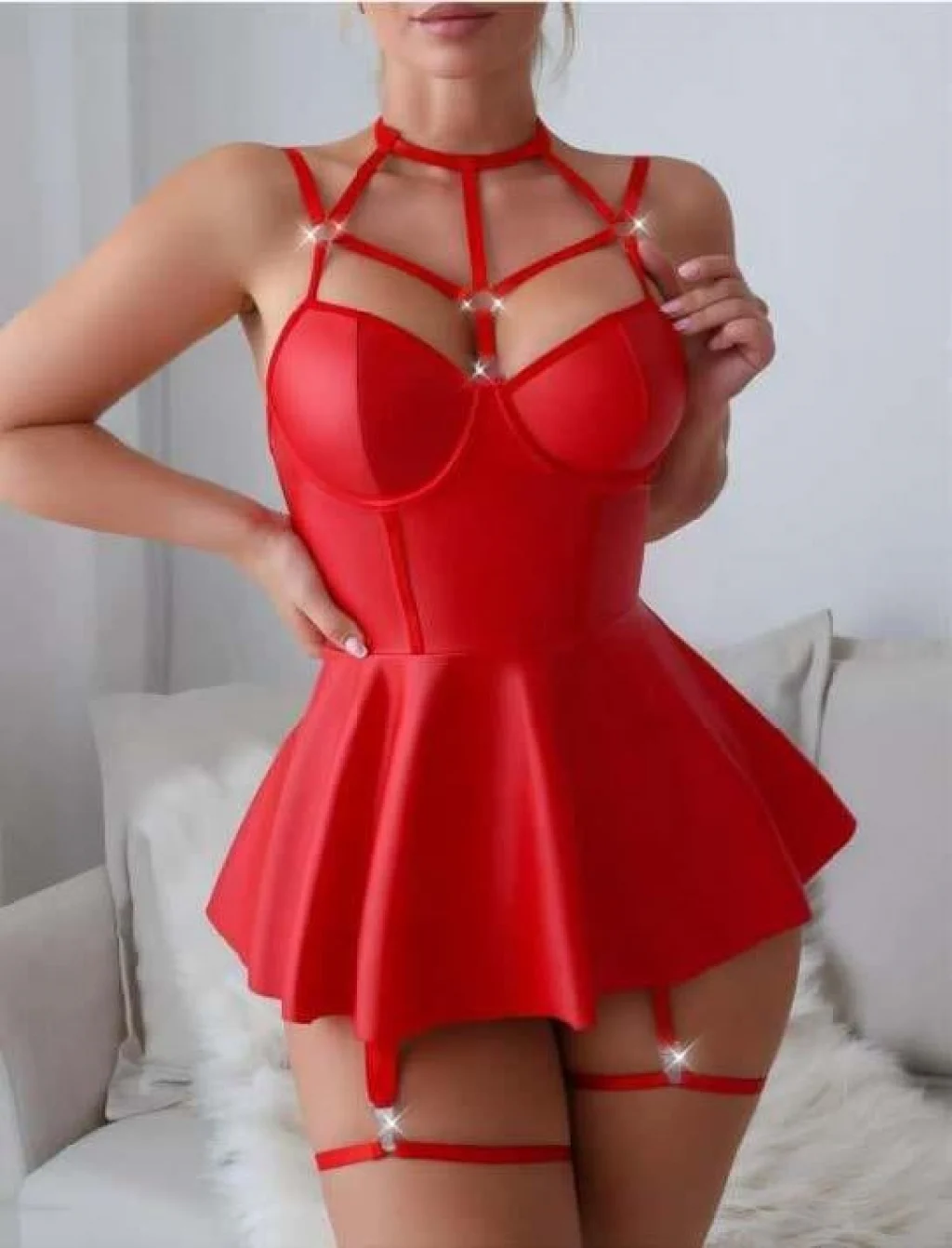 Luz&Pos Aria's Closet Kırmızı Fantezi Parlak Deri Şık Club Elbise