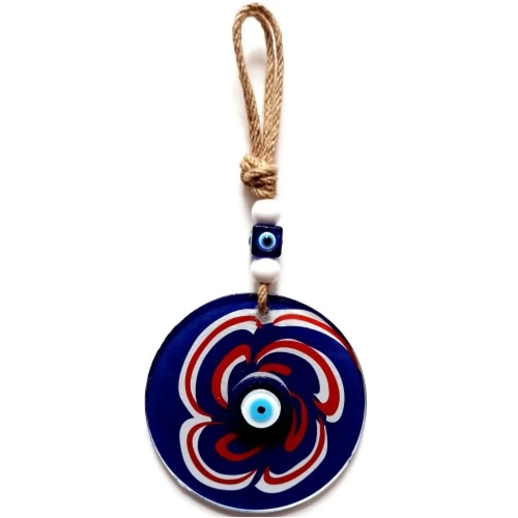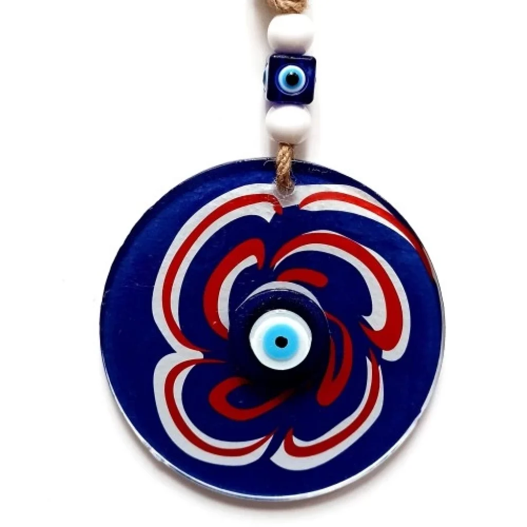Cam nazar boncuklu şeker modelli duvar süsümüz 12 santimetre çapındadır. Duvar süsümüz ip dahil 26 santimetre boyundadır. Ürünümüz füzyon cam malzemeden üretilmektedir.