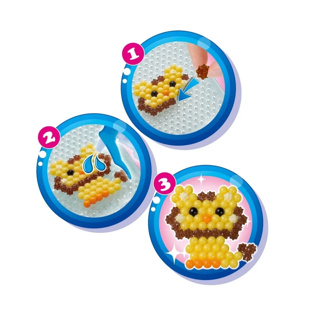 3 farklı tip boncuk içerir: Kristal boncuk, normal boncuk ve Star Bead boncuk. Tüm Aquabeads setleriyle uyumludur.