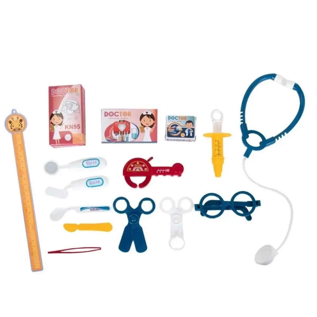 Kutu içerisinde; doktor masası, stetoskop, ateş ölçer, şırınga, ilaç kutuları, gözlük ve makas gibi çeşitli aksesuarlar yer almaktadır.