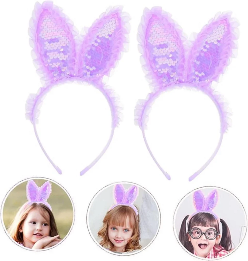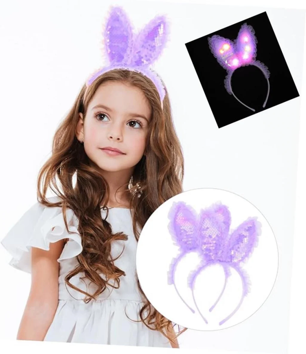 Eğlencenin ve şıklığın bir araya geldiği Kenarları Dantelli Mor Pullu Payetli Led Işıklı Tavşan Kulak Taç ile partilerin yıldızı olun!