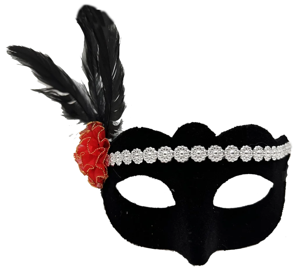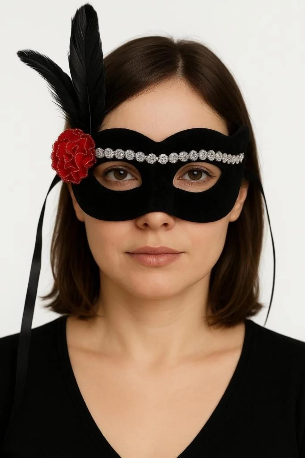 Siyah Renk Süet Kaplama Gümüş Dantelli Kırmızı Gül Tasarımlı Parti Maskesi, balolar, maskeli partiler veya özel geceler gibi özel günlerde romantik ve zarif bir görünüm elde etmek isteyenler için mükemmel bir seçimdir. Yumuşak süet kaplaması, gümüş dantelleri ve zarif kırmızı gül tasarımı ile bu maske sizi partinin en şık konuğu yapacak.